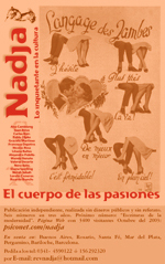 El diseño de esta nueva edición de Nadja está montado sobre una frontera móvil: la impropiedad del cuerpo, la pasividad del pathos, la inconmensurabilidad del roce del otro. Como si se tratase del aciago río del aforismo de Heráclito -el mismo en el cual no podemos sumergirnos por segunda vez- este número se encabalga en los confines entre el psicoanálisis y la fenomenología. Parajes por los que andan desterrados uno en el otro, en una desconocida filiación, según el tipo de las leyes enunciadas por Mendel para la herencia de ciertas flores rojas y blancas.